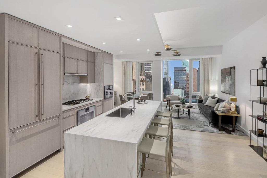 This expansive two bedroom, two and a half bathroom residence designed by Champalimaud offers northern exposures through floor-to-ceiling windows. White oak flooring throughout leads from the entry into an open living and dining concept, complete with a chef's kitchen offering honed Capri marble countertops, backsplash, and a waterfall island with room for seating. The kitchen has a refined aesthetic with streamlined custom white oak millwork that seamlessly integrates a full Gaggenau appliance package, including an undercounter wine refrigerator, complemented by Dornbracht fixtures.