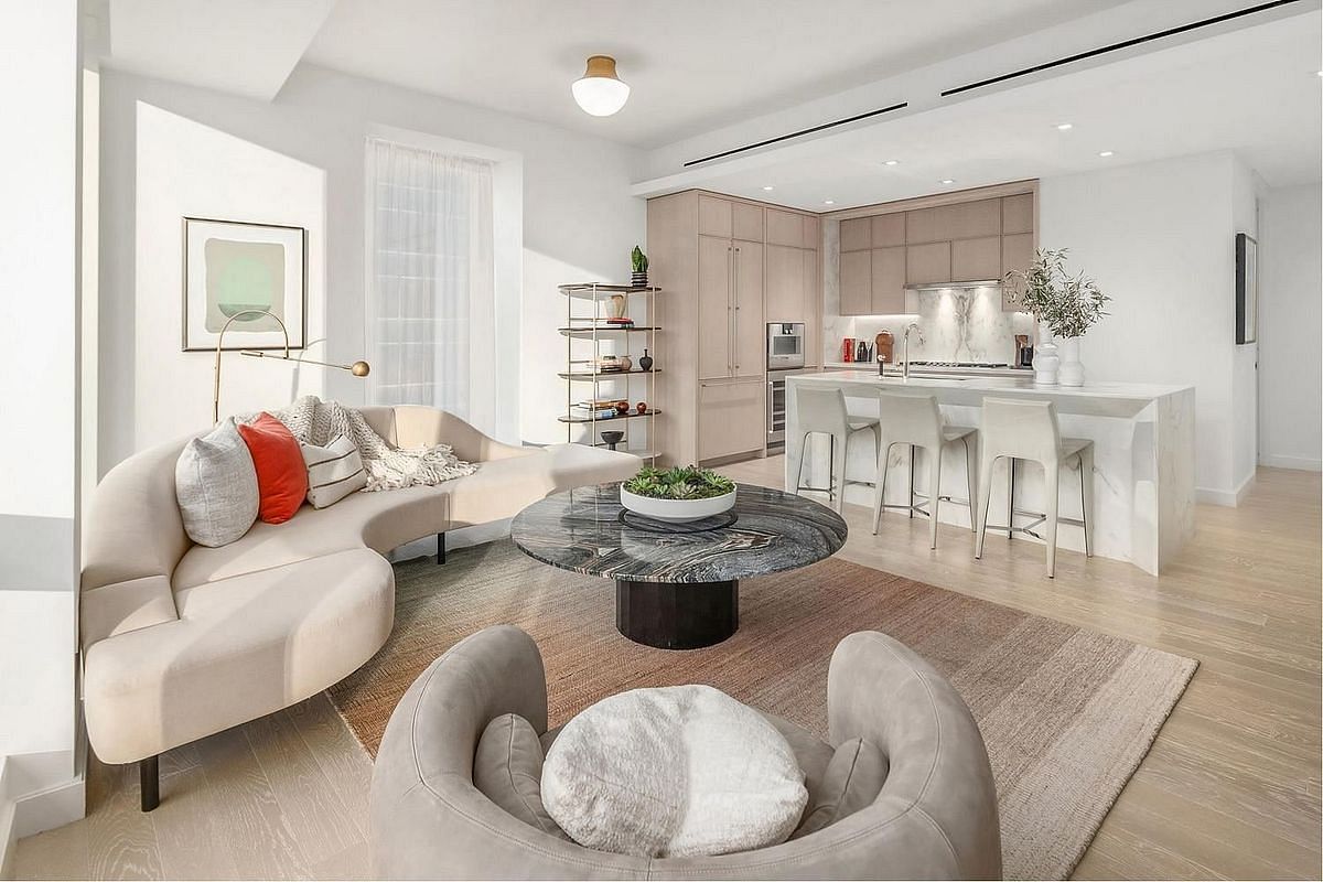 This expansive one of a kind two bedroom, two and a half bath residence designed by Champalimaud offers North, South, and Eastern exposures through floor-to-ceiling windows. White oak flooring throughout leads from the entry into an open living and dining concept, complete with a chef's kitchen offering honed Capri marble countertops, backsplash, and a waterfall island with room for seating. The kitchen has a refined aesthetic with streamlined custom white oak millwork that seamlessly integrates a full Gaggenau appliance package, including an undercounter wine refrigerator, complemented by Dornbracht fixtures.