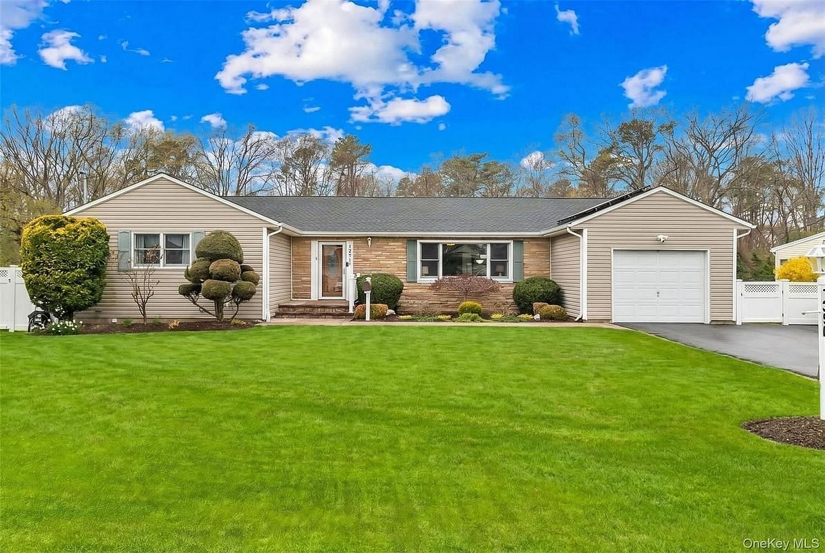 Welcome to this beautiful expanded ranch located in the desirable Bay Shore school district! This well-maintained home features 3 bedrooms and 2 full bathrooms, including a primary bedroom with an en suite. The custom eat-in kitchen boasts stainless steel appliances and flows beautifully into the formal dining room, formal living room, and spacious den with sliding doors leading to the backyard. Hardwood floors run throughout, adding warmth and charm. Exterior highlights include a brick and vinyl exterior, a one-car attached garage, owned solar panels, front and back 7-zone in-ground sprinklers, paver front walkway and back cement patio, professional outdoor lighting, fully fenced yard with gorgeous landscaping and perennial gardens! Additional features include a full unfinished basement, 200 amp electric, a new oil tank, and 1-zone hot air heat. This is the one you have been waiting for!~