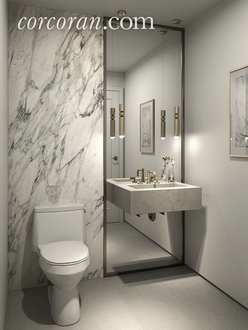 The primary suite offers a serene retreat with ample storage and a spa inspired en-suite bathroom with honed Vanilla Marble and a deep Zuma soaking tub. A luxury powder room, high ceilings, wide-plank oak floors, and a Bosch washer/dryer add to the seamless blend of luxury and comfort.