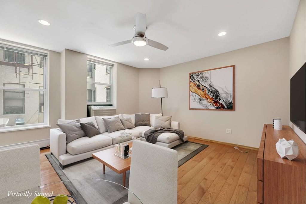 This renovated 1 bedroom/1 bath residence offers an open layout concept overlooking the building's courtyard. The kitchen with white shaker kitchen cabinetry, Calacatta quartz countertop, and a stainless-steel appliance package - LG refrigerator/freezer, whirlpool dishwasher, and a GE convection oven for a sophisticated and modern living. The bathroom offers a soaking tub with subway tile surround, white shaker vanity, crane toilet and ceramic mosaic tile flooring. Outfitted custom closets, recessed lighting, ceiling fan, windowed air-conditioning unit, new double pane windows and red oak wood flooring complete the residence.