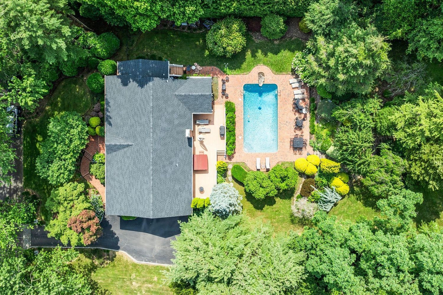 The expansive primary suite impresses with soaring ceilings, a spa-like bath with a soaking tub, and sliding glass doors leading to the backyard. Step outside into a true backyard oasis—surrounded by lush flower gardens and mature trees for added privacy. Featuring a gunite pool with brick patio, and an upper-level lawn with basketball court. A two-car garage offers direct access to a full basement, providing abundant storage and the potential for additional living space.
