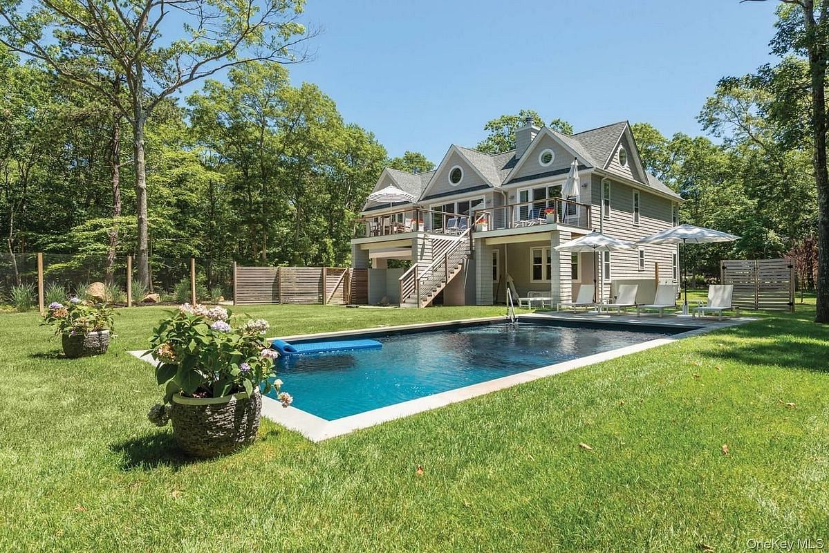 Up a long, private driveway, with beautiful views of Three Mile Harbor and the picture perfect sunsets over the marina, stands this architecturally striking, Modern shingle-style home conveniently located to the shops, restaurants, ocean and bay beaches of East Hampton. With high-end touches of a coastal lifestyle throughout, the first level features a dramatic interior stair tower with unique railings and large, round windows, a deep mudroom with laundry and access to the enclosed lush yard and pool area, two bright guest bedrooms, a separate office/4th bedroom, and a large full bath with double sinks. With sweeping Westward views of the water, the second level features an open living room with vaulted ceilings and white beams, fireplace, and double sliding glass doors to the large deck, eat-in kitchen with a gracious island and all top-of-the-line appliances, a bright dining area with seating for 10, and a separate, sea-inspired powder room. Additionally, the second level boasts a primary suite with its own access to the deck and a dreamy, marble-tiled bath, complete with large silestone counters, double sinks, extra-long soaking tub, and a glass-surround shower. Exterior amenities include a 36' x 18' pool with bluestone patio, lush lawn and an enclosed outdoor shower. With a Porte Cochere at the entrance and a desirable amount of seclusion at the end of the private road, this well-appointed, custom-built home sits high above the competition.