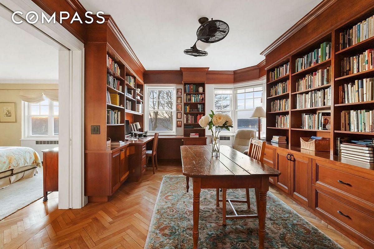 The master suite faces directly west over the Hudson River and has been renovated with his and her custom walk-in closets and luxurious bathroom. Sliding doors connect to the adjacent library/study, with custom built-in bookcases, desks and reading nook, ideal for a professional couple. This space could be converted to an additional bedroom, if needed. (See alternate floor plan 1)