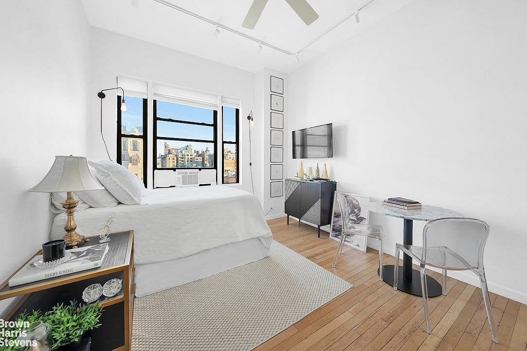 Enjoy 10.5 foot high ceilings and oversized windows define this delightful studio overlooking the gorgeous city skyline full of architecturally significant buildings that define the Upper West Side. This cheerful space is primed for your personalization. Original hardwood floors flow seamlessly through the space creating a clean canvas ready for personalization. The bathroom is freshly updated with white tile throughout. Kitchen is compact yet functional, with potential to be easily expanded easily within the footprint. Joyfully sunny, all day long with twinkling lights in the evening cityscape view make this apartment feel like the perfect perch point to call home, to treasure for the next chapter of your life.