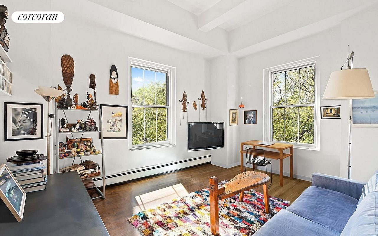 The sun-drenched corner living room has a feeling of a private sanctuary. Framed by oversized windows that capture sweeping vistas of Tompkins Square Park and the skylines beyond. Soaring 11-foot beamed ceilings create a sense of volume and light, while oak hardwood floors give the space warmth and sophistication. Additionally, a windowed kitchen with a coveted view of the Midtown skyline including the Empire State Building makes any chef happy.