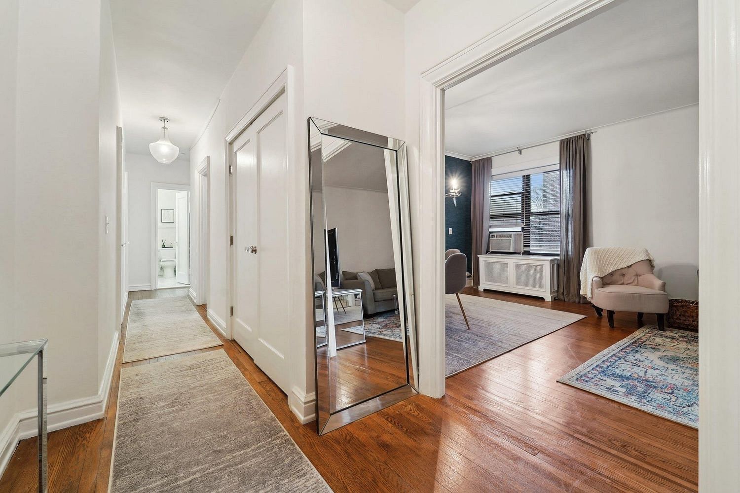 Welcome to Apartment 3J at 143 Garth Road in Scarsdale – a beautifully maintained, move-in-ready one-bedroom, one-bathroom co-op offering 850 square feet of bright and inviting living space. This spacious home features gleaming hardwood floors throughout, an updated eat-in kitchen with stone countertops, custom glass-and-wood cabinetry, and stainless steel appliances. The large living and dining area is filled with natural light, creating a warm and welcoming atmosphere. The generously sized bedroom offers ample space, and the home includes five closets, three of which are custom-designed, providing exceptional storage. The renovated bathroom features elegant marble flooring and modern finishes. Residents enjoy building amenities such as a laundry room, a private storage unit, and a beautifully landscaped terrace overlooking Garth Woods. The property is conveniently located just steps from the Metro-North station, offering a quick 30-minute commute to Manhattan, and is within close proximity to shops, dining, and the Bronx River Parkway and Trail. Residents are eligible for membership at Lake Isle Country Club, which offers golf, tennis, and swimming. On-street parking is available with a free permit from the Town of Eastchester. This pet-friendly building allows one dog with restrictions. Don’t miss the opportunity to experience comfort, convenience, and quality living at 143 Garth Road, Apartment 3J.