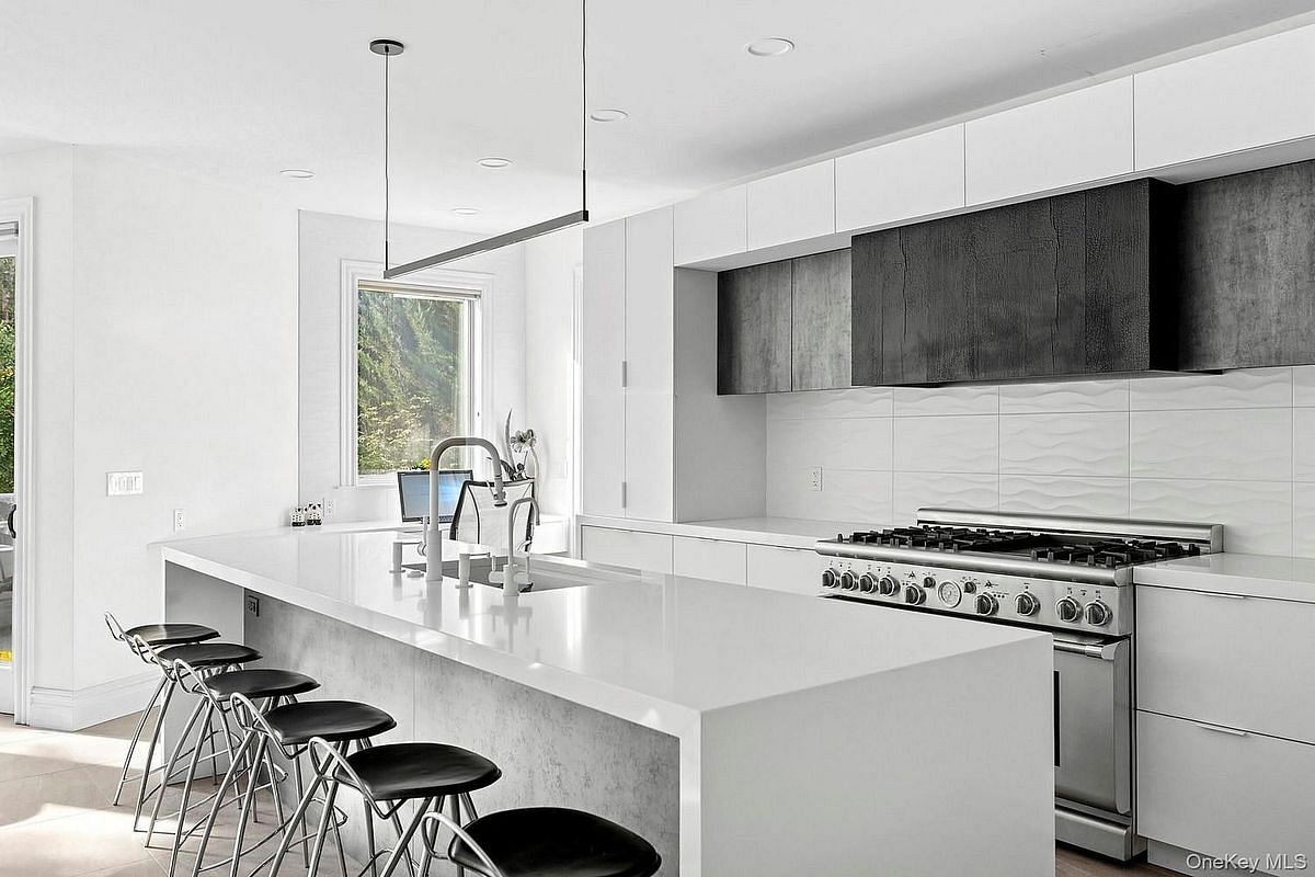 Half Hollow Hills School District. Experience luxurious living across three levels in this beautifully renovated residence set on nearly two private acres in coveted West Hills. The dramatic Great Room features 20-foot ceilings and expansive windows framing serene property views, complemented by a newly renovated wet bar.
