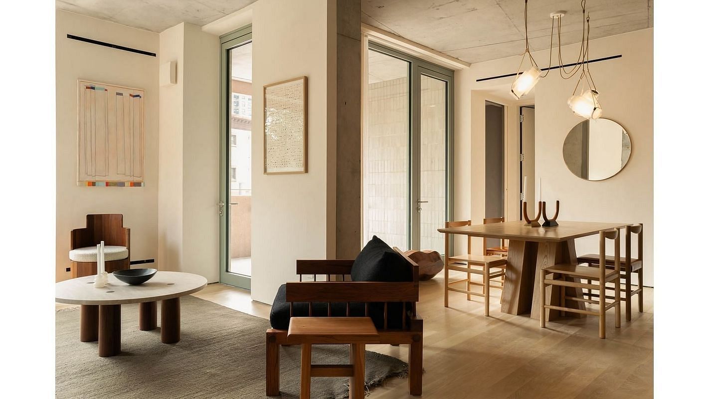 Residence 3E comprises 1,258 SF, offering two bedrooms, two bathrooms, East exposures and a 55 SF private terrace. Upon arrival through a separate entry landing, white oak floors, exposed concrete ceilings and natural lighting set the tone for modern, design-forward living.