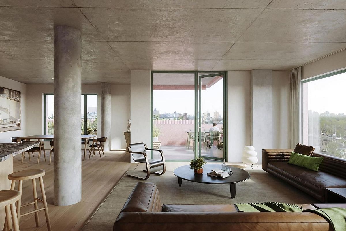 Experience open living in Residence 6A: a 2,184 SF, three-bed, three-bath home with North, South, and East exposures and 251 SF of outdoor space spread across a terrace and a loggia. The arrival experience begins outside of your front door with a separate entry landing. Upon entering the foyer, white oak floors, exposed concrete ceilings and natural lighting set the scene for modern, design-forward living.