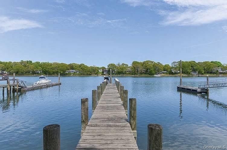 Located on protected Menantic Creek flowing into West Neck Harbor with direct access to open water, this contemporary waterfront is designed for easy summer living. Set on approximately one acre, the property offers a balance of privacy and usable waterfront space. Angular rooflines and clerestory windows bring in consistent natural light while maintaining a sense of seclusion. The main living space is centered on a sculptural fireplace that anchors the room beneath radiating ceiling planes. Clean wall expanses were designed to accommodate artwork, while the open layout extends naturally to the dining area and out to a wraparound deck for outdoor living. A recently renovated kitchen with breakfast bar is set just off the main space. The primary suite offers direct access to the deck and a full bath with built-ins and vanity. Two additional first-floor bedrooms each open to their own outdoor areas and share a hall bath. The main level encompasses approximately 1,870± sq. ft. The lower level adds approximately 1,500± sq. ft. of recently renovated space, including a family room with wet bar, a bonus room, full bath, laundry area, and office, with doors and windows opening to outdoor patios. The grounds are arranged in tiers along the waterfront, with multiple areas for seating and entertaining, including a deck surrounding the Gunite pool, a patio, and a lawn stretching out to the dock, which has a floating platform, a boater's dream!