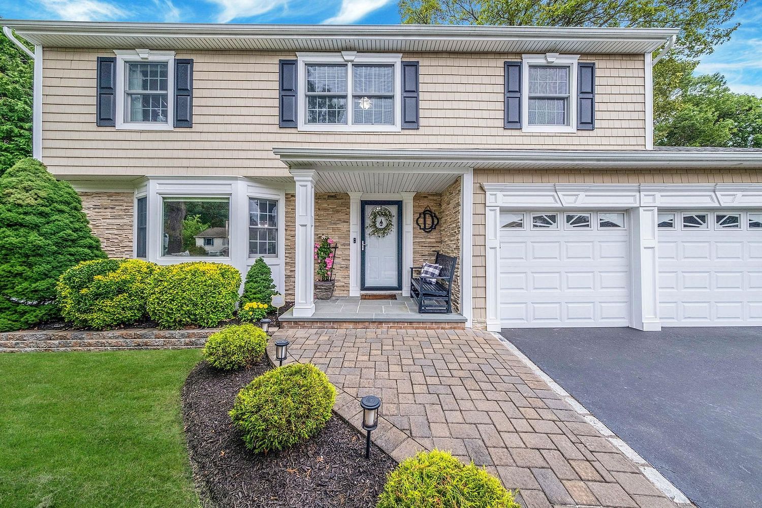 This move-in ready Colonial home features 4 bedrooms and 2.5 bathrooms. The front porch adds charm to the exterior. Inside, you will find a spacious living room with large windows. The eat-in kitchen is equipped with stainless steel appliances and granite countertops. The formal dining room includes French doors leading out to the rear patio. The family room has a fireplace, hardwood flooring, interior door to garage and French doors that open to the rear yard. The master suite includes vaulted ceilings and an ensuite bathroom. Additionally, there are 3 bedrooms and a hall bathroom. The property includes a young roof and exterior siding, a fenced yard, inground lawn sprinklers, a paver patio with pergola, paver driveway and walkway, and a fully landscaped backyard in a mid-block location. Other features include central air conditioning, double pane windows, natural gas, hot water, and a 2-car garage.