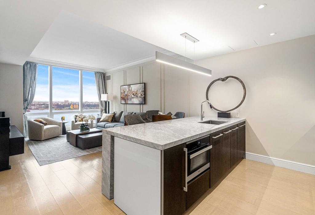 A tasteful foyer with a coat closet and space for an entry table flows into an open plan living room, dining room, and kitchen saturated with western light. The kitchen is sophisticated and refined, equipped with an eat-in peninsula, polished Italian Trambiserra marble countertops and backsplash, custom cabinets, and fully integrated Miele appliances. The bedroom has a walk-in closet and can accommodate a king-size bed, and the luxurious bathroom features radiant heated floors, polished Blue de Savoie slab walls, a custom floating double vanity with built-in under storage, a walk-in rain shower, and a deep soaking tub.