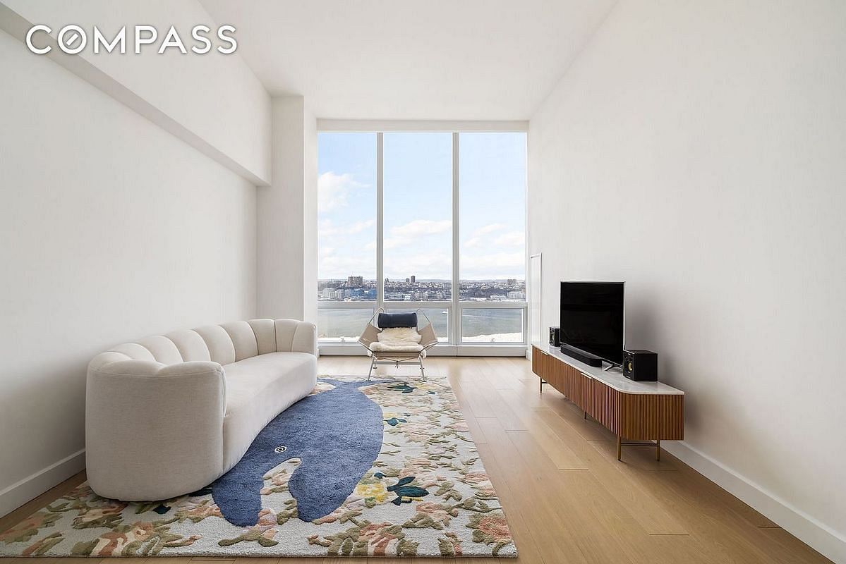 This stunning one-bedroom residence boasts soaring 12-foot ceilings and panoramic Hudson River views. The open, sun-filled layout features a chefs kitchen with Miele appliances, marble countertops, breakfast bar, and abundant custom cabinetry perfect for entertaining. The bedroom suite includes a massive walk-in closet and spa-like marble bathroom with soaking tub, glass-enclosed shower, heated floors, and double sinks. Modern comforts include vented washer/dryer, Nest climate control, and automated shades throughout.