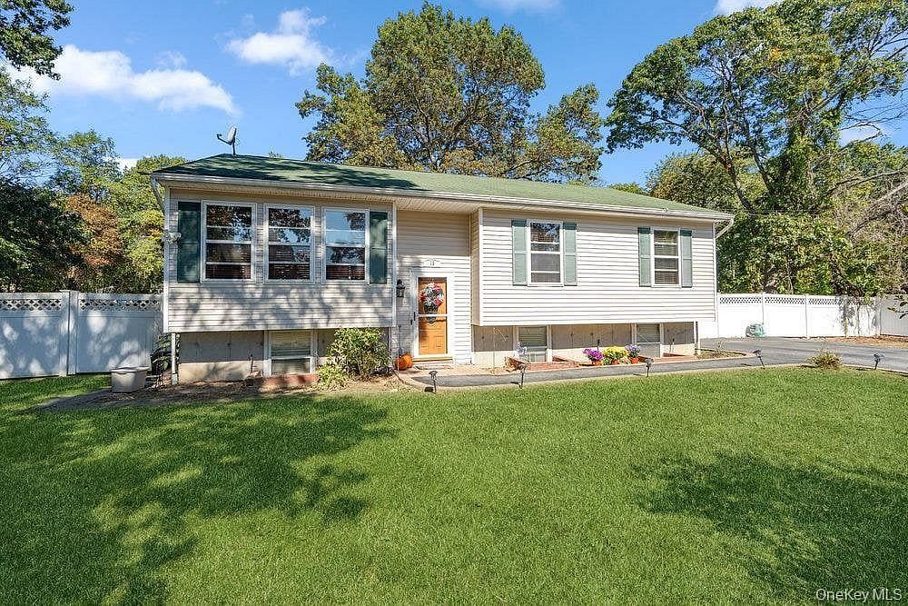 Welcome home to this beautifully maintained 4-bedroom, 3-bath Hi-Ranch, perfectly situated on over an acre at the end of a quiet dead-end street. Built in 1998 and owned by the same family since, pride of ownership shows throughout. Step inside to find vaulted ceilings, natural hardwood floors, and tons of natural light. The kitchen offers stainless steel appliances and flows seamlessly into the open living and dining areas — ideal for entertaining. The primary suite features a private full bath, while the finished lower level with an outside entrance provides plenty of flexibility for guests, extended family, or a home office. Enjoy a fully fenced yard with room to relax, play, or expand. Conveniently located near major shopping, public transportation, and just a short drive to the Southern State Parkway, Sunrise Highway, and Bay Shore Mall. A rare find with space, location, and long-term care — this one checks every box.