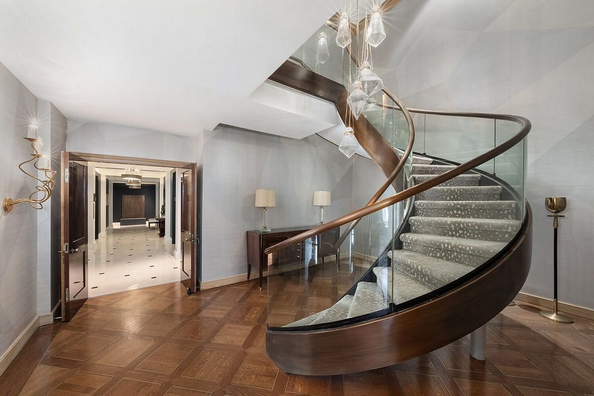 Spanning the full north and south exposures, this palatial duplex is a masterpiece of proportion, volume, and light. A dramatic double-height foyer with an imposing circular staircase introduces the residence, leading to an enfilade of grand entertaining rooms measuring nearly 100 feet in length. Floor-to-ceiling windows frame mesmerizing views of the Manhattan skyline, Central Park, and beyond, while multiple setback terraces-totaling over 2,000 square feet-invite outdoor dining and entertaining above the city.