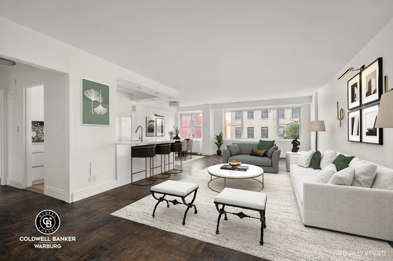 As soon as you step into the apartment, you're greeted by a spacious, bright living room with oversized windows that overlook tree-lined streets and classic townhomes. The room is over 30 feet long, with soffit lighting that adds a warm, inviting touch. There's also a roomy dining area, perfect for meals, or it can easily be turned into a third bedroom or office. The newly renovated kitchen is open and modern, designed for today's lifestyle, with plenty of counter space and sleek finishes.