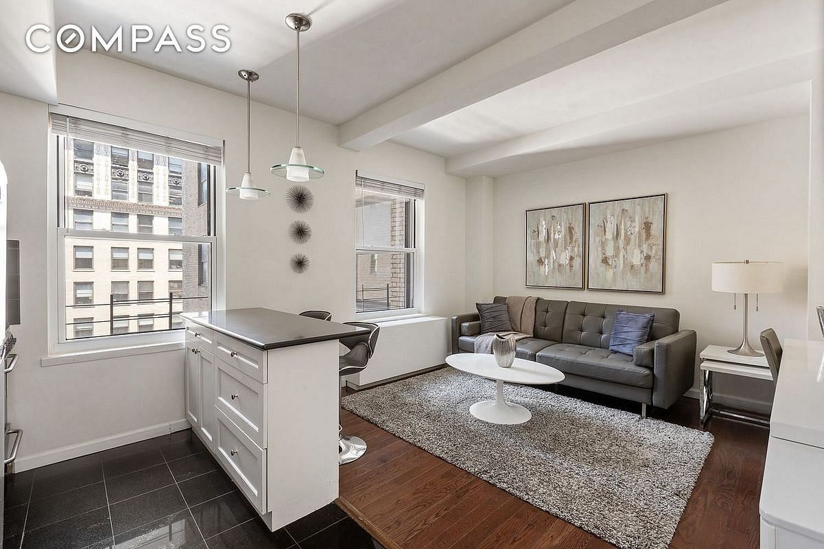 Residence 1017 is a sunlit, city-facing 1-bedroom nestled in the vibrant heart of Midtown Manhattan. This thoughtfully designed home boasts an open, renovated kitchen that seamlessly connects to the living area, perfect for entertaining. The kitchen shines with crisp white cabinetry, sleek black stone countertops, and premium stainless steel appliances, while the bathroom exudes classic charm with its elegant white subway tiles.