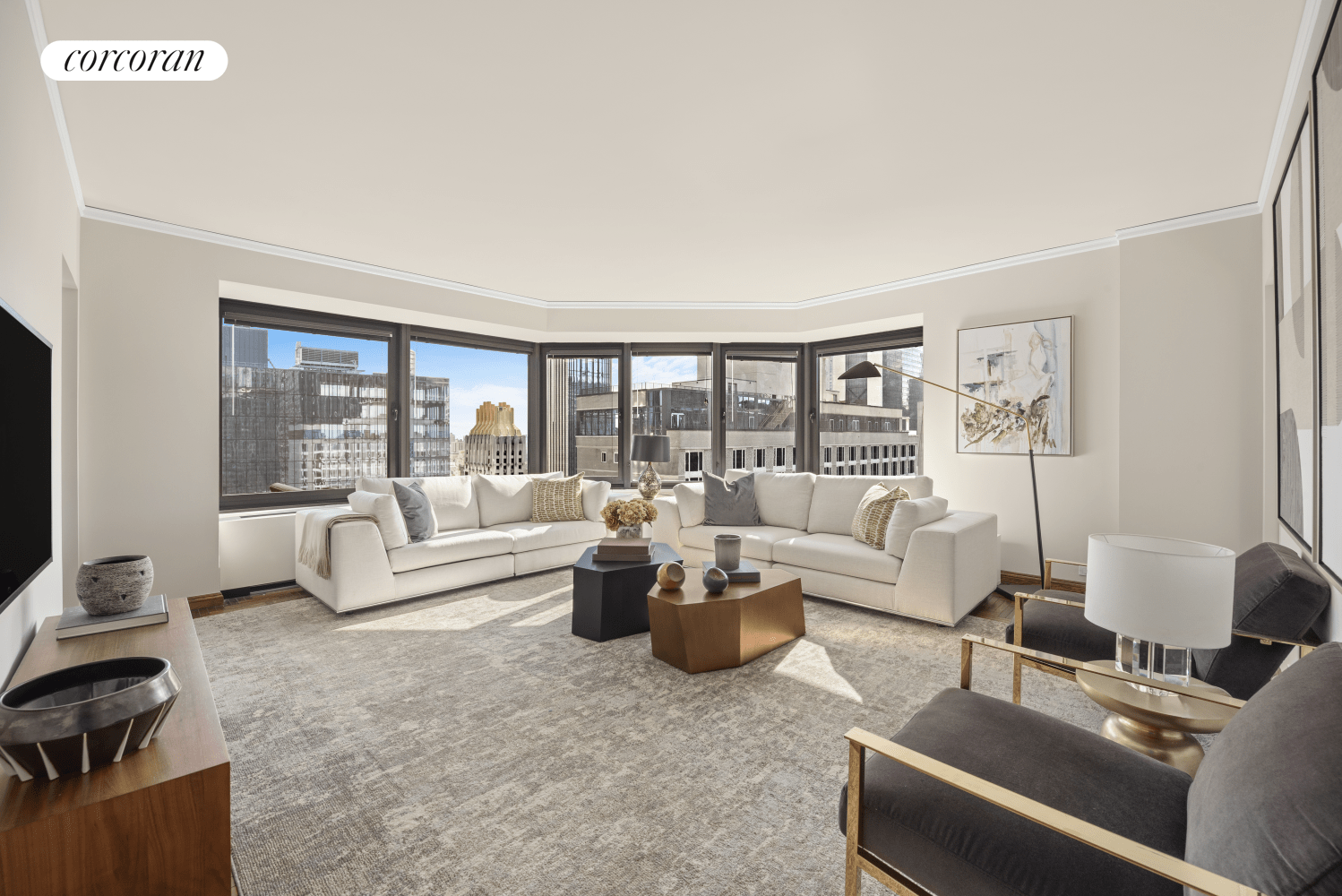 The generously sized living room, nearly twenty by twenty feet, features northeast facing bay windows that flood the room with natural light throughout the day and offer a Central Park moment. The primary suite, appropriately split from the rest of the home is equally impressive, boasting custom millwork, and a luxurious spa-style bathroom. Additionally, the second and 3rd bedrooms come with their own en-suite bathroom and offer expansive views of the city, along with ample closet space. A washer/dryer is permitted with board approval and can be installed in various locations throughout the apartment.