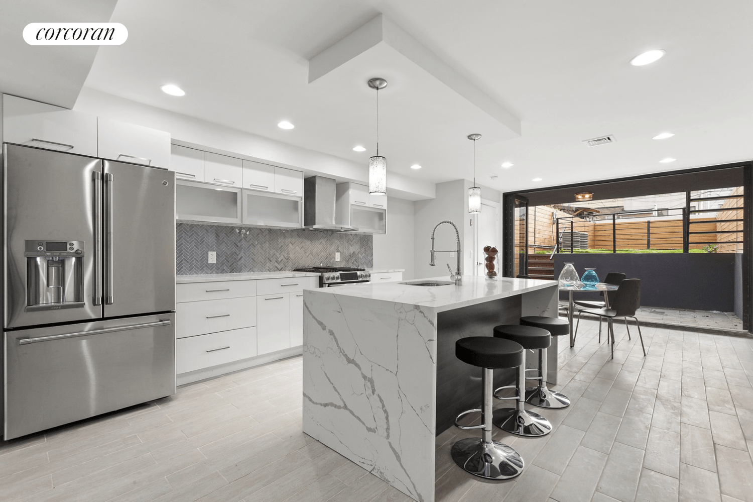 The kitchen has full size appliances, a gas range, center island and tons of storage and counter space. Spanning 43 feet from front to back, with a powder room tucked in the middle- the living room, dining and kitchen are the heart of the home. On the second floor, the master bedroom has a glorious and sunny terrace with stairs to the backyard, an en-suite bathroom, and two closets. A full bathroom in the hallway, a private home office, and a second bedroom are also located on this level.