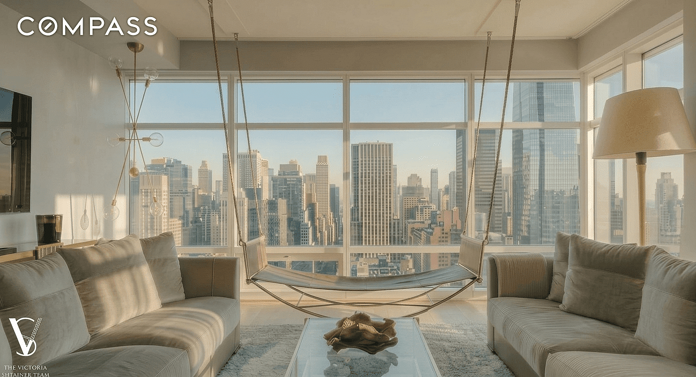 This corner two-bedroom, two-and-a-half-bath offers a clean, modern aesthetic with curated designer upgrades throughout. A proper entry foyer sets the tone, leading into a sunlit living and dining space framed by expansive windows with open skyline views and a direct outlook toward Central Park. The proportions feel right, polished enough for entertaining, comfortable enough for everyday living.