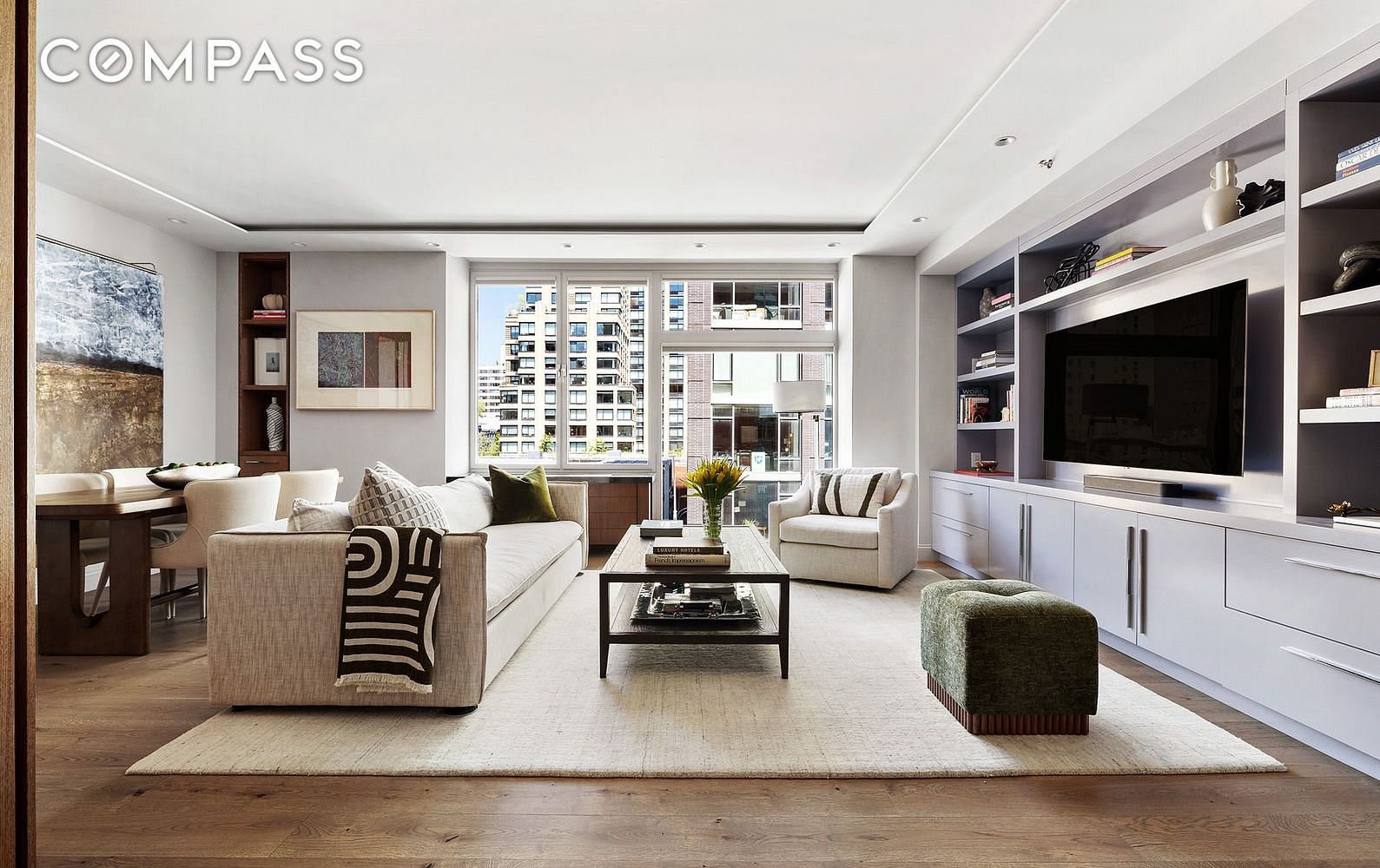 Converted from its expansive two-bedroom layout, this inviting three-bedroom, two-bathroom you enter 4G from the semi-private elevator landing. The beautiful woodwork offset by the open chef's kitchen featuring a large Quartzite marbleized waterfall island leads you into the heart of the great room perfect for entertaining or cozying up for your favorite shows, with your TV framed by a gorgeous wall of custom shelving.