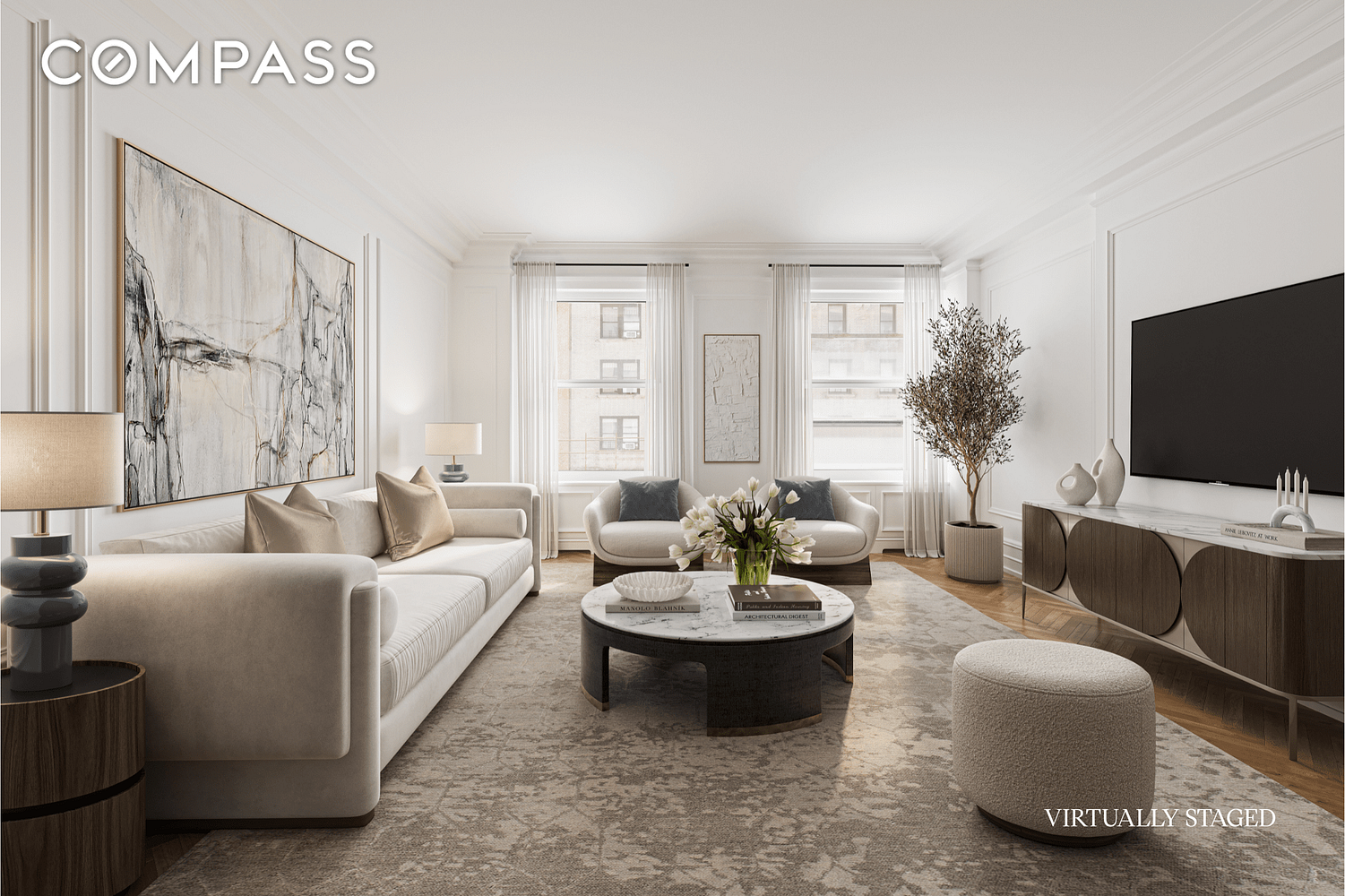 With only two apartments per floor, the home offers exceptional privacy and quiet. A semi-private elevator landing leads into a formal gallery, which opens to a nearly 20-foot-wide, sun-filled living room overlooking treetops on West 86th Street. Adjacent is an expansive formal dining roomideal for large-scale entertaining or easily repurposed as a den or secondary living space.