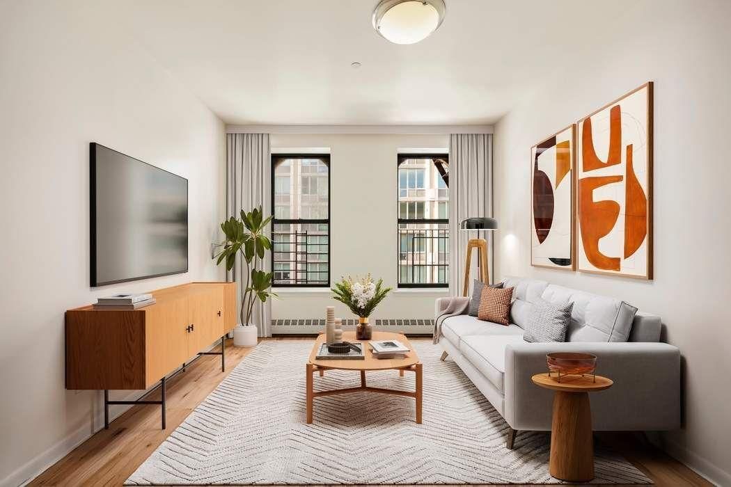 Rarely available, sunlit, and spacious, this two-bedroom apartment wonderfully situated in Carnegie Hill has been freshly painted, updated, and ready for you to make it your own. Located on the 4th floor of a fantastic 8-unit building, this floor-through home features a flexible layout, with the living room and open kitchen boasting sunny western exposures, and a hallway leading to two railroad-style bedrooms, providing privacy and quiet enjoyment. A split two-bedroom layout can be easily achieved by converting the current living room into the primary bedroom and using the existing primary bedroom as the living room. The open kitchen with ample storage space features a brand-new stainless-steel refrigerator and stove. Hardwood floors, four large closets, a new Bosch washer/dryer and a European wall air-conditioner complete this not-to-be-missed gem. The building is in exceptional financial health resulting in an exceptionally low monthly maintenance of $276.