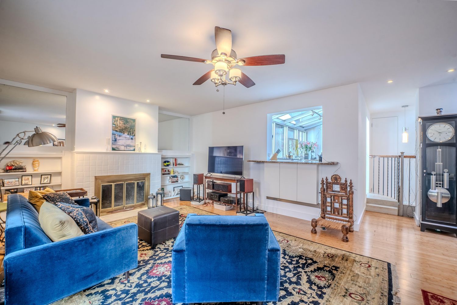 Come inside and the entryway leads you into the main floor that includes a very spacious living/dining room with a working fireplace. In the kitchen you can see the sky thanks to a wall of glass that extends overhead. The primary bedroom, also on this level is spacious and private with a marble-clad on-suite bath.
