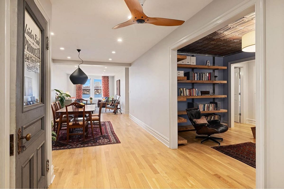Also off the dining area is a Large Library/Den, and between the library/den and Main Bedroom is the Second, smaller Bedroom. The library/den has a beautiful Tin Ceiling, originally salvaged from a South Carolina home, and Timbered Shelving rescued from a Queens factory, ready for your book collection.