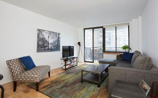 The apartment boasts an open and airy layout, with plenty of natural light streaming in from the floor to ceiling glass door. The living room is spacious and features beautiful hardwood floors, and a spacious private balcony facing south. The primary bedroom also facing south is generously sized and features a walkin closet. That bathroom has been recently updated and the kitchen looks through to the living area.