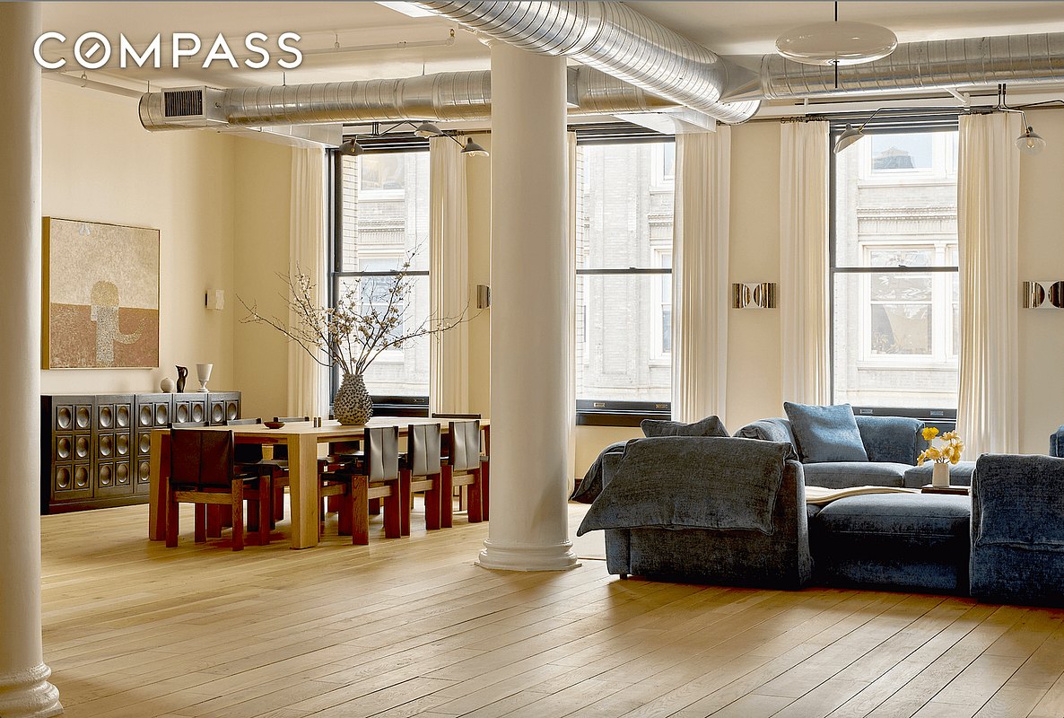 Spanning 4,678 square feet with four bedrooms and four and a half bathrooms, you enter directly from a private elevator into a sizable entry gallery with an adjoining walk-in closet with custom millwork. The lofts main living space is expansive at over 2,000 square feet featuring original structural columns and industrial elements paired with reclaimed white oak flooring. 32 feet of oversized windows facing east and ceiling heights exceeding 11 feet allow for plentiful morning light and scale throughout. A wood-burning fireplace, clad in Italiano Marmorino, creates a natural sitting room with north-facing windows and classic Soho exposures. The oversized kitchen is exceptionally equipped, with custom cabinetry, striking marble countertops including a striking Rosso Levanto island, and professional-grade appliances by Wolf and Sub-Zero. A dedicated guest suite shares the homes east-facing expanse, with a built-in murphy bed and en-suite bathroom offering added flexibility as a dedicated office. Storage is plentiful as well, with a walk-in pantry and additional adjacent service areas including an oversized laundry room and two additional storage rooms.