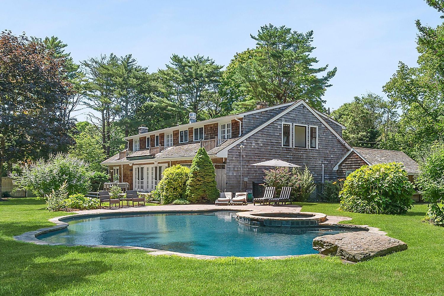 This gorgeous country estate is a true oasis located on a quiet waterfront lane and down a private driveway just east of Turkey Bridge in charming Quiogue with immediate access to Westhampton Beach Village shopping and gorgeous ocean beaches. Set on over an acre, the farmhouse-style home has been completely renovated and updated and features six large bedrooms (four en-suite), five full bathrooms and two half bathrooms. The grand primary suite features a designer hotel-like bathroom, a wood burning fireplace and sunny balcony. There is also a lovely en-suite bedroom on the first floor. Designer decorated with impeccable details and custom finishes throughout there are multiple gathering and entertaining spaces both inside and out including a great open living and dining room with fireplace, an oversized and spectacular eat-in chef's kitchen with a huge island, new stainless steel appliances, professional Wolf stove, and two Sub-zero refrigerators. The home spans two floors of gracious living spaces including a large home office/den, a spacious den/multi-purpose room with walls of French doors leading outside, a large gym/sport room, and an expansive open mud room with laundry and a bathroom that is accessible to the outdoor space. For the fine wine collector there's a hidden climate controlled cellar for storage and tastings. The sprawling outdoor amenities include mature lush gardens and expansive lawns and a large heated free-form Gunite pool with room for a sport court. Secluded and very private yet just a stone's throw from all the village has to offer. A spectacular offering in a prime location!, Additional information: Interior Features:Guest Quarters,Lr/Dr