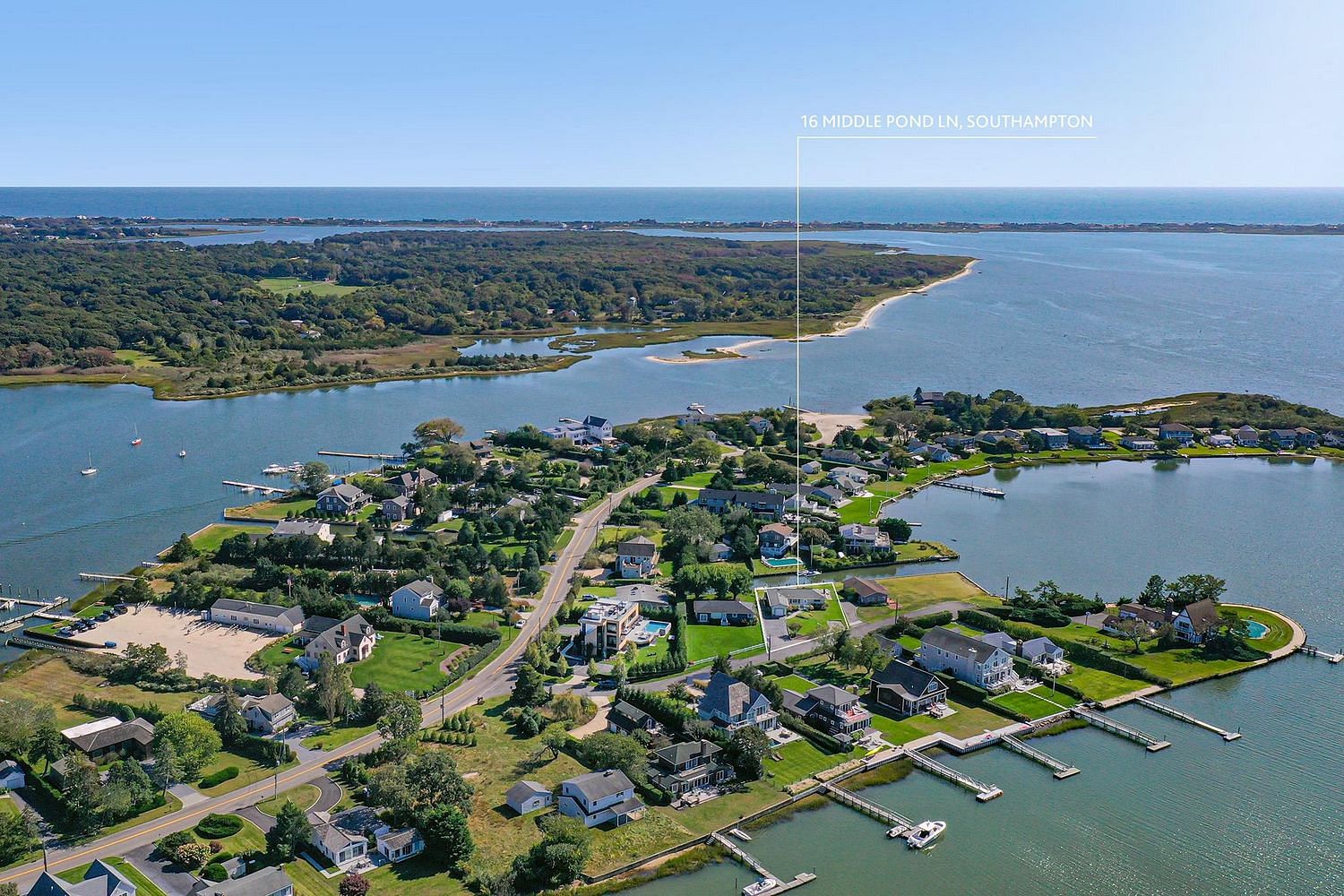 Surrounded by panoramic water views and complete with a private dock. Just renovated, this 3-bedroom home has lots of charm with hardwood floors, exposed brick, and great natural light. An updated kitchen has stainless steel appliances and an adjacent dining space with sliding glass door egress to the patio. The exteriors feature a fire pit, outdoor shower, and ample patio space with a retractable awning, creating a warm and inviting atmosphere for gatherings and evenings by the water. Experience the beauty of waterfront living combined with easy access to nearby Southampton Village's many shops, dining, and cultural experiences.