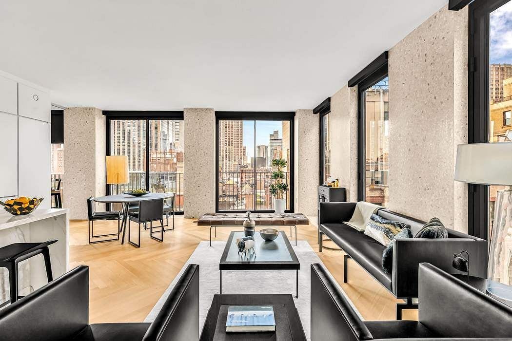 LIVE ON THE INCOMPARABLE BRYANT PARK. The exceptional awaits in this 2-bedroom, 2.5 bath beauty with captivating Empire State Building views and radiant south light. Designed by renowned architect David Chipperfield. No detail overlooked. Only the best-of-the-best materials were employed in its interior and exterior design. Elements include: terrazzo walls, herringbone quarter sawn fumed oak wood floors, radiant heat floors, Calacatta Gold marble counters and backsplash and lacquered millwork cabinetry. The high-end, integrated open kitchen features Gaggenau appliances, vented range hood and Matt Black Dornbracht fittings and bar dining. Spa baths include: Statuarietto marble slab walls. The floor-to-ceiling windows allows light to permeate the residence with divine tranquility. Both bedrooms have sumptuous en-suite baths. The primary bedroom boasts a 5-fixture bath with wet room, soaking tub and rain shower and double vanity. The secondary bedroom has an en-suite bath with a glass-enclosed shower. There is a stunning powder room and a welcoming foyer. There are three central air zones and washer/dryer.