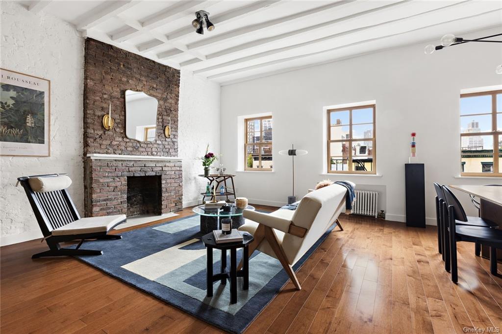 Welcome to this full-floor 2 bedroom 1.5 bathroom home perched on the top floor of a charming Chelsea brownstone. Fully renovated and designed by a French architect, this home combines the charm and beauty of a prewar apartment with stylish and convenient modern upgrades. -The sprawling, meticulously designed living space is features high ceilings, exposed beams, and two decorative fireplaces -Flooded with natural light via three exposures East in the bedrooms, South in the kitchen, West in the living & dining areas. -Central A/C and Lutron light system -Washer/Dryer in-unit -Custom millwork with generous closets throughout the apartment -Kitchen features ceiling-height cabinetry, a stainless sink and refrigerator, with a built-in paneled dishwasher, and Calacatta marble countertops and backsplash -Primary bedroom with walk-in closet and an en-suite bathroom with marble bathtub & the secondary room 160 Ninth Avenue is a four-story landmarked boutique co-op in the heart of Chelsea near the Meatpacking District. The neighborhood boasts excellent art galleries, abundant shopping, hotels, and convenient transportation, including Chelsea Market, The Chelsea Hotel, David Zwirner, Gagosian, Shukette, The Standard High Line, The Whitney, and so much more. A/C/E/L/1 Subway Lines and Citibike Stations nearby.