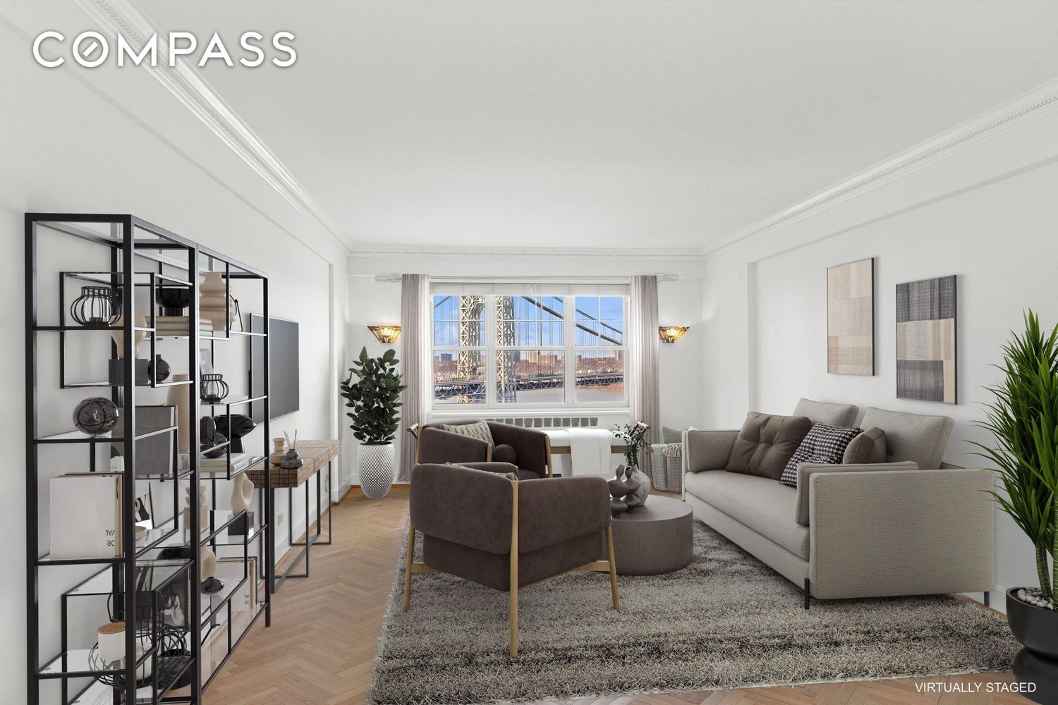 Breathtaking views of the Hudson River, Palisades and GWB south to lower Manhattan await you in this absolutely stunning 2-line one bedroom in Castle Village. Here a modern classic is born. Dentil crown moldings adorn the sunken living room grounded by pretty herringbone floors, while the kitchen and bathroom offer a sleek modern aesthetic and all the luxury that delivers.