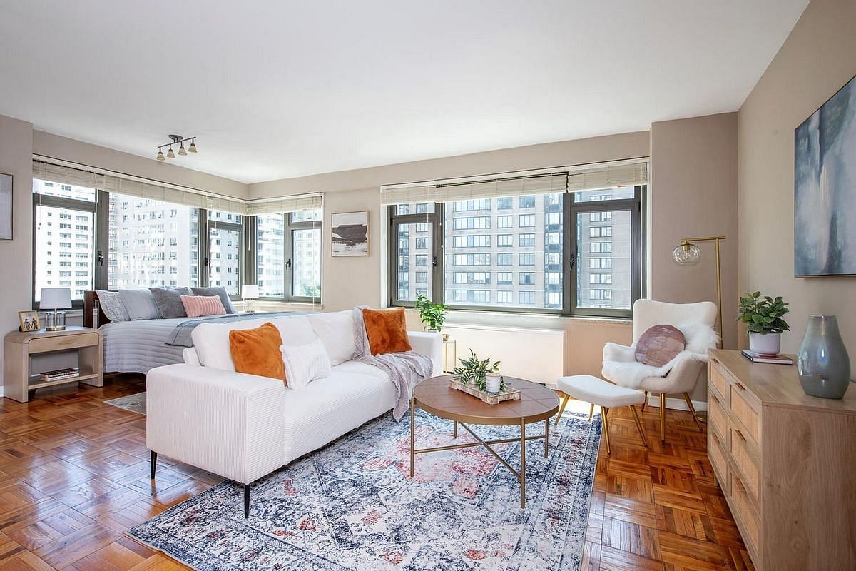 Convertible Junior One-Bedroom at The Phoenix - Upper East Side Luxury Cooperative Residence 8A at The Phoenix offers a rare opportunity to create a junior one-bedroom in a full-service Emery Roth-designed cooperative. This oversized alcove studio enjoys a corner position with two exposures and walls of oversized, sound-reducing windows that flood the home with natural light while ensuring quiet comfort. The flexible layout is ideal for modern living.