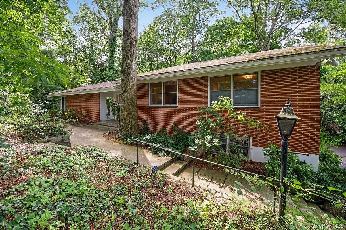 Mid-century contemporary ranch located in an enchanting setting. A hallmark of this home is the very special living room with a 14 foot cathedral wooden ceiling and magnificent large windows letting in natural light and views of the park-like property. A see-through brick fireplace connects the living room and formal dining room creating wonderful entertaining spaces in an open floor plan. The kitchen is updated with a large island to gather around. A heated sunroom provides amazing views and is a favorite feature year round. There are 3 bedrooms, 2 full baths, a den and plenty of storage. An attached 2 car garage plus driveway parking makes living very convenient. Fabulous location in prime Lawrence Park West neighborhood near Sarah Lawrence College and Bronxville Village. 0.7 mile to Bronxville Metro North Station