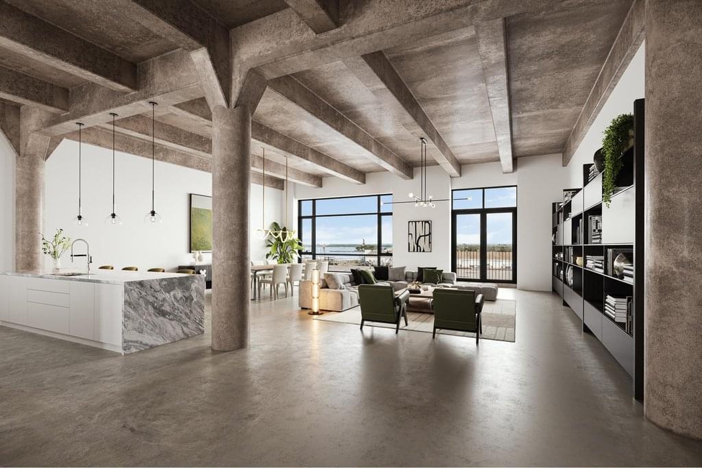 Waterfront living at the historic New York Dock Building in Red Hook. Built in 1910, this was the first reinforced steel and concrete building in the United States. The classic loft spaces endow these exceptional units with grand proportions, soaring 12'+ ceilings, and stunning views.