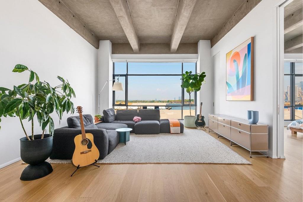 The generously sized living room features an oversized double-glazed steel window framing stunning western views, ideal for both morning sunrises and hosting gatherings. The thoughtfully designed layout provides iconic views of the Statue of Liberty, the Manhattan skyline, and the expansive harbor.