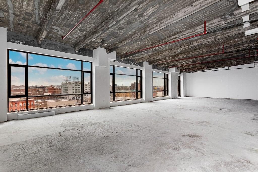 Exposed original concrete ceilings and columns frame the enormous proportions