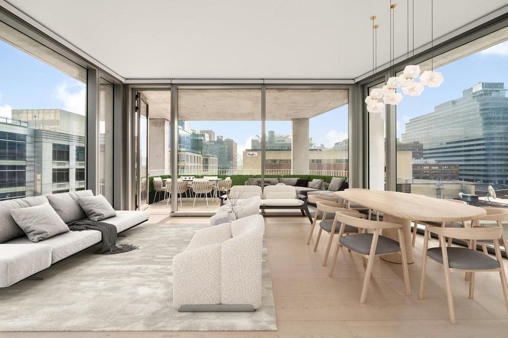 Greeted by a long gracious Entry Gallery with walls ready for art and sun flooding in from the broad South open exposure with dramatic 11 foot floor-to-ceiling windows. You arrive into a jaw dropping triple exposure great room with a magnificent adjacent terrace that is able to accommodate a second outdoor Living and Dining Room. An open and inviting Bulthaup kitchen is ready for entertaining with state of the art appliances, cool custom Larchwood cabinets, and an oversized sleek Sivev marble eat-on island.
