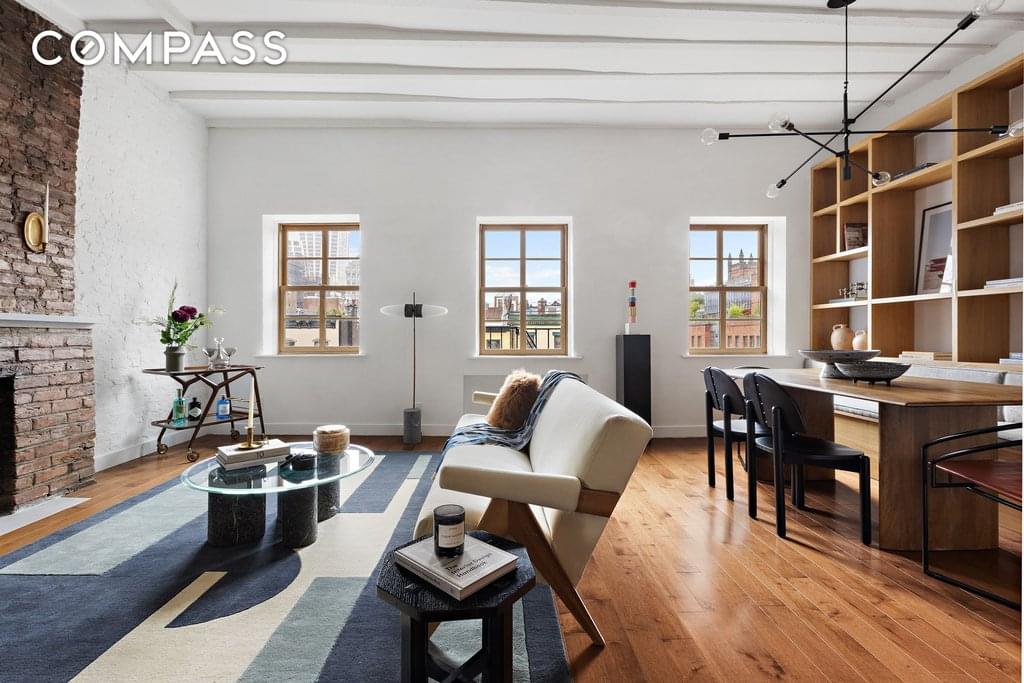 -The sprawling, meticulously designed living space is features high ceilings, exposed beams, and two decorative fireplaces