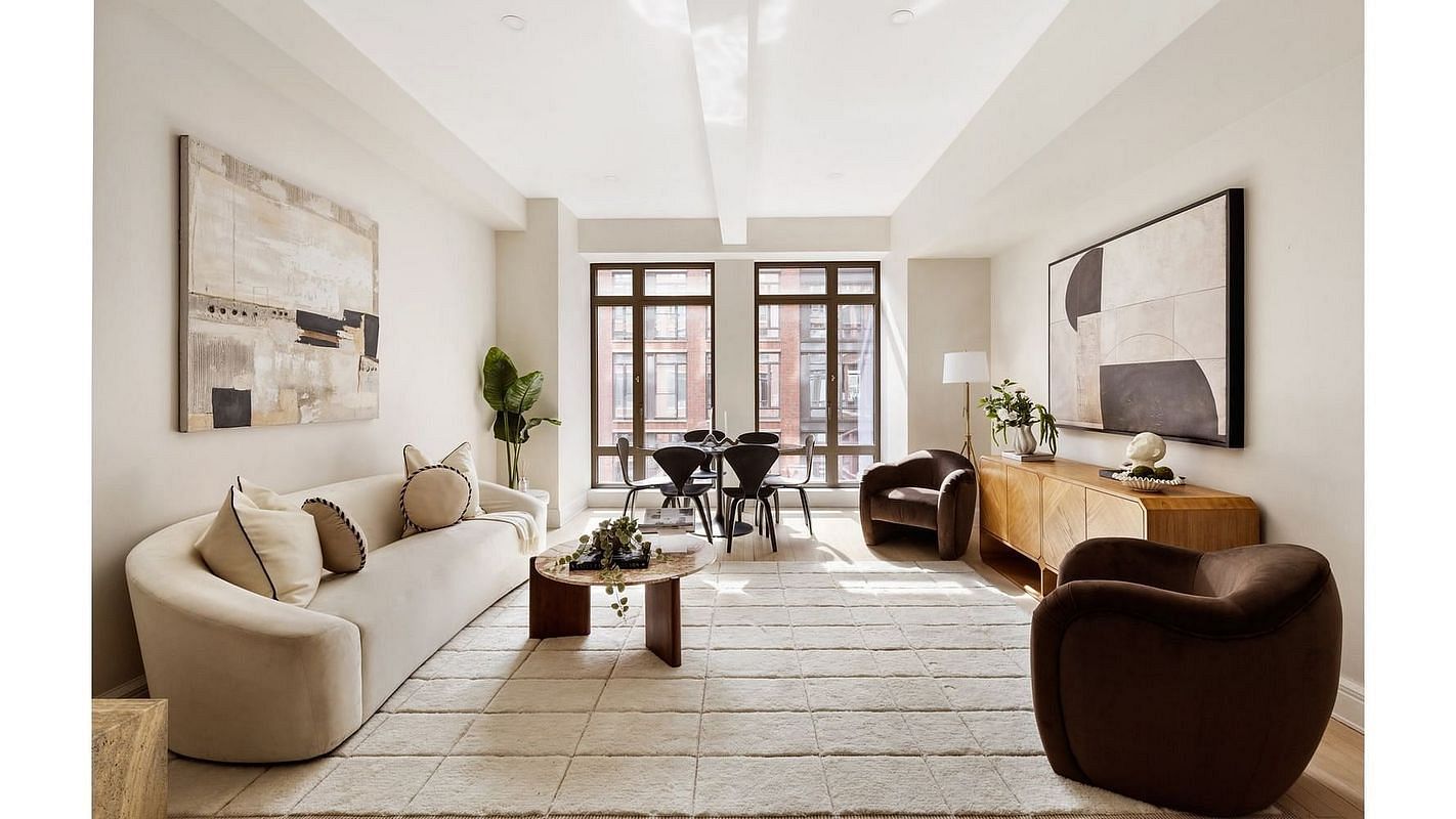 The grand living room is illuminated with natural sunlight and accommodates both dining and entertaining areas. The luxurious open chef's kitchen is outfitted with top-of-the-line Sub-Zero, Wolf, and Miele appliances, as well as two spacious pantries. Efficiently laid out for cooking, the kitchen also features elegant white marble countertops and backsplash, along with designer lighting.