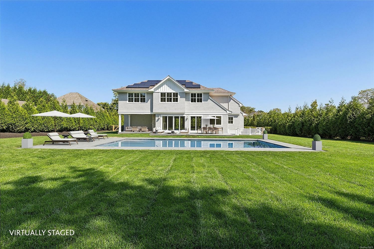 Luxurious new construction from the prestigious Hamptons Paramount Development Group is the ultimate forever home in the Hamptons with sunny pool. On a deep and privacy affording flag lot, surrounded by mature planted trees, with generous clearance allowances to suit your taste. This brand-new private retreat is perfectly suited for East Hampton Village Fringe with classic cedar-shake siding. Inside, this is the best of open-concept contemporary luxury living on 3-levels, ready to impress with 6 bedrooms, 5 full baths, a powder room, an attached 2-car garage, and a finished lower level. The entry foyer is flanked by a dedicated dining room and ensuite jr. primary with a walk-in closet and luxe bath. Beaming with natural light, the great room is stylish and sophisticated with a fireplace, premium appliances, and walled with sliding glass doors that open to the rear patio backyard. Completing the first level is a mudroom off the garage, laundry, and powder room. Upstairs, the primary suite has its own wing of the home is luxuriously appointed with a salon-like bath, dual vanity, and dual walk-in closets. Each ensuite and comfortably sized, 3 additional bedrooms are found on the other side of the home. The walkout lower level adds 2 guest rooms, a full bath, and a large playroom. Outside, your own private oasis includes a covered outdoor living room with a fireplace, plenty of space for dining al fresco, and a large, sunny gunite pool at the center of the grounds. Enviably close to East Hampton Village and just moments from nearby Nick & Toni's, plus the world-class ocean beaches and many designer boutiques found across the Hamptons.