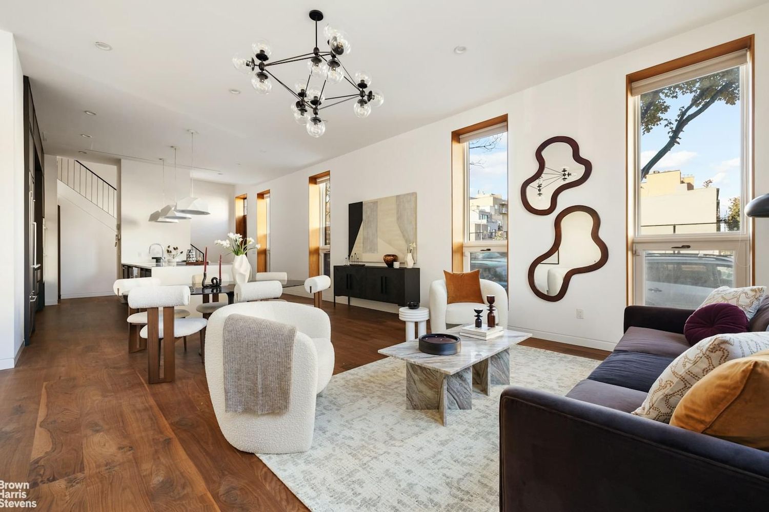The home features two private roof decks, including one with incredible Manhattan views, perfect for convenience and entertaining. The open first floor showcases high ceilings and custom details including Madera Trade black walnut floors and industrial-chic finishes. A state-of-the-art kitchen is fitted with black steel Subzero Wolf appliances and a large custom island with breakfast bar seating, perfect for hosting or casual dining.