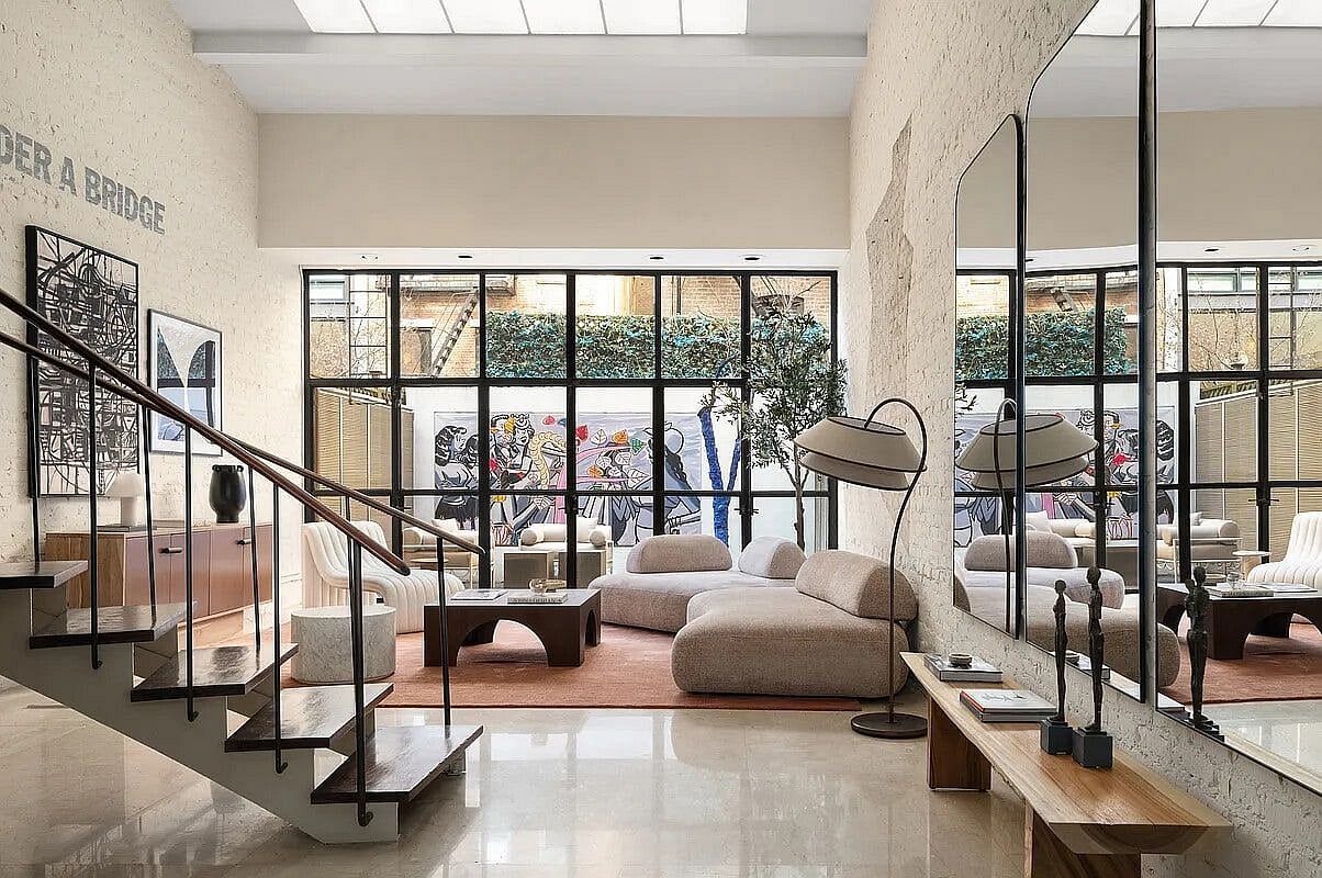 With ceilings rising approximately 19 feet, the living room reveals an extraordinary architectural volume rarely encountered in private homes. Bathed in natural light from a skylight above and framed by soaring brick walls, the room possesses the scale and presence of a private gallery. Floor-to-ceiling windows overlook the tranquil 350-square-foot garden, creating a striking visual connection between the dramatic interior and outdoor spaces.