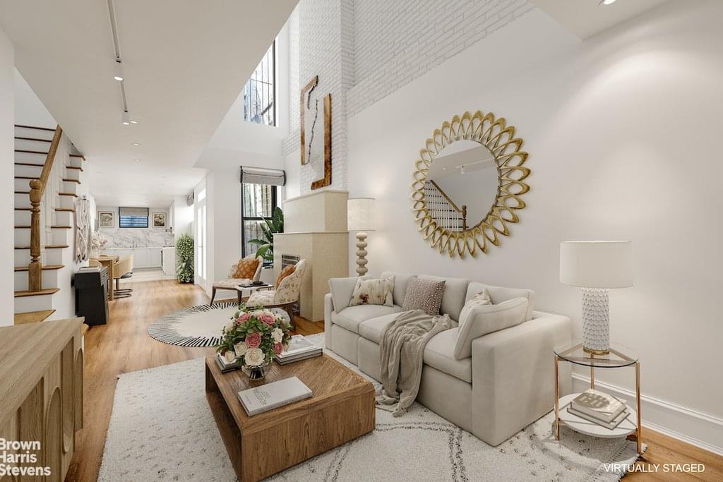 The parlor floor level includes the primary bedroom with an ensuite bathroom fully equipped with steam shower and heated toilet seat. On the same floor, the second bedroom offers a generous size and can accommodate a queen-size bed. The adjacent bathroom has been recently completely renovated and includes a charming clawfoot tub. The hallway between the bedrooms feels like a mezzanine and opens up onto the double-height living room, providing soaring ceilings and extra light to the lower level.