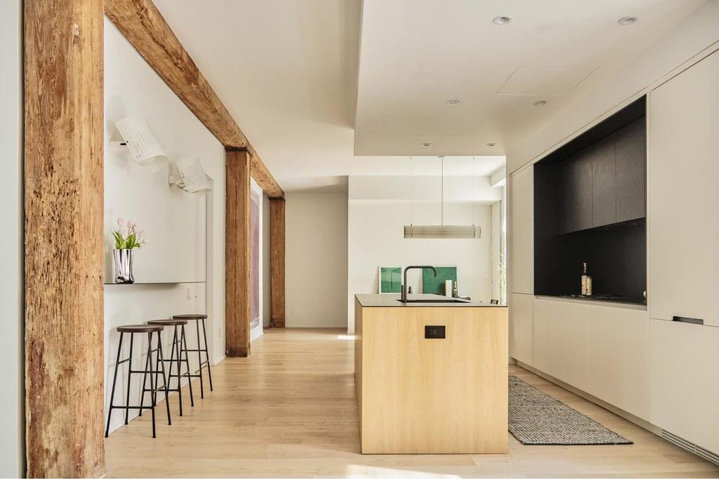 The One at 168 Plymouth Street is a spacious 1,371ft one bed, two-bath residence featuring characteristics of a classic DUMBO loft including high ceilings, restored and painted white brick, longleaf pine timber beams and columns, and wide-plank white oak floors.